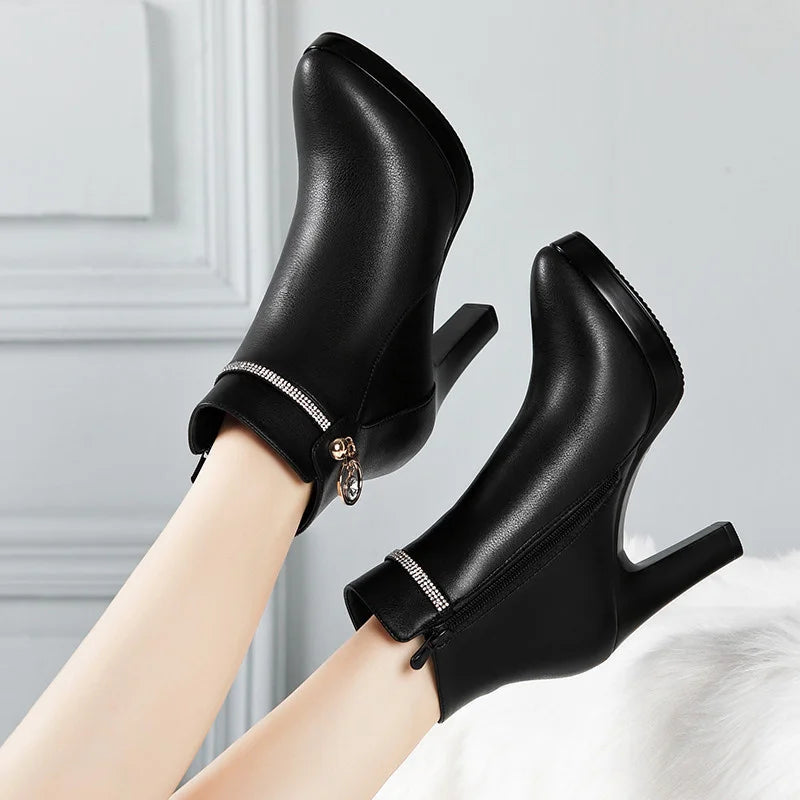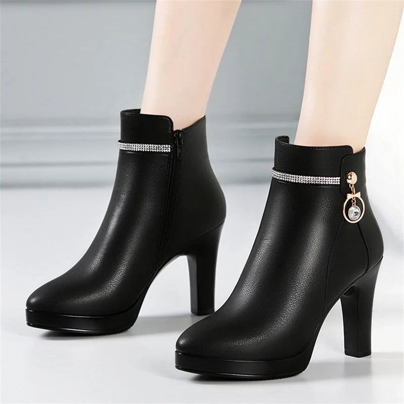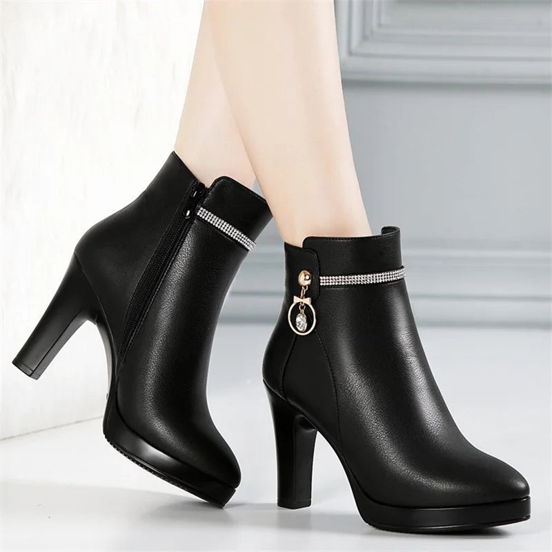 Comfortable Fashion Soft Leather Winter Shoes Platform Boots 2024 Elegant Black Block High Heel Plush Non-slip Ankle Boots